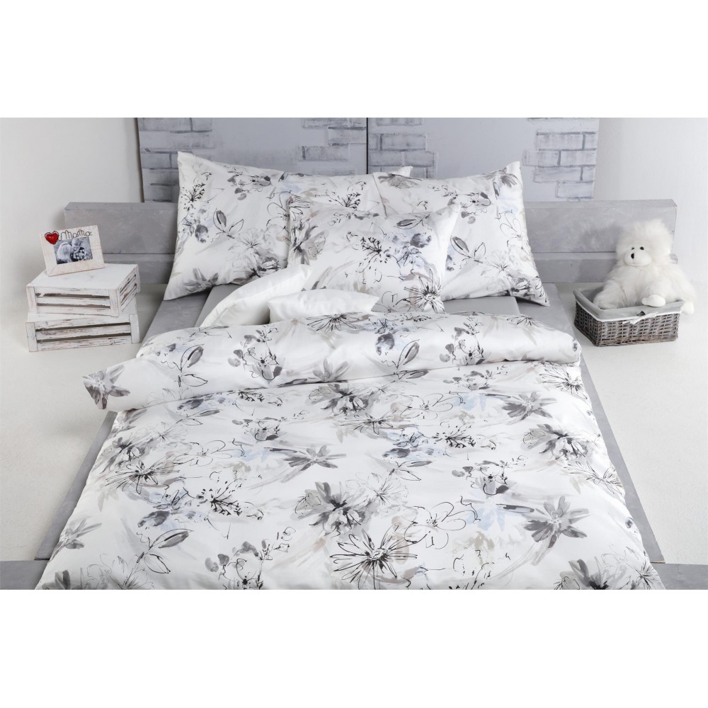 Tamara R Bettwäsche aus mercerisiertem Satin RONJA grau, modernes Blumenmuster auf hellem Grund, aus hochwertiger Mako-Baumwolle. Marken Satin Bettwäsche Tamara R Selection - ausschliesslich Dessins und Stoffe höchster Qualität. Nur die besten Druckereien erhalten Aufträge für diese Kollektion! Mit aussergewöhnlichem Charakter und geniessen absolute Exklusivität.