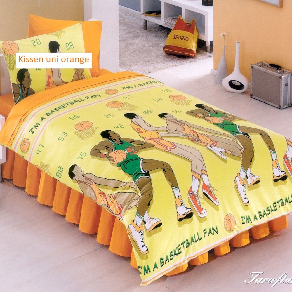 Schöne Basketball Kinder-Bettwäsche-Garnitur von Tamara R, (die Kissen sind Uni orange), aus 100% Baumwoll-Renforcé. Zauberhaft jungendlich schöne Motive und Farben die das Kinderzimmer auffrischen. Einfach schön und angenehm schlafen. Diese Kinderbettwäsche wird in der Schweiz verarbeitet und hergestellt und dies erst noch zu einem günstigen Preis.
